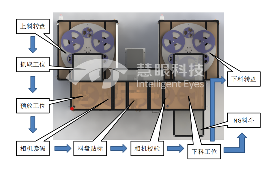 慧眼科技研发的料盘一维码、二维码自动扫描设备,是基于机器视觉原理实现快速上下料、自动打印贴标,料盘回仓数据录入、一维码数据比对、标签缺陷检测等功能。